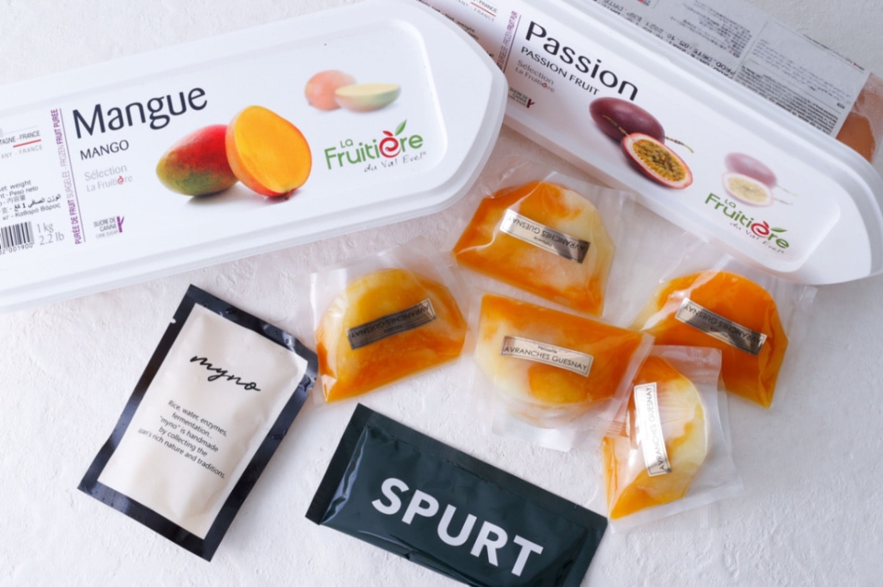 マンゴーピューレとパッションフルーツピューレのゼリーと、スパートパウダーと酵素甘酒マイノのゼリーがマーブルに混ざり合い、濃厚でフルーティに仕上がっています。